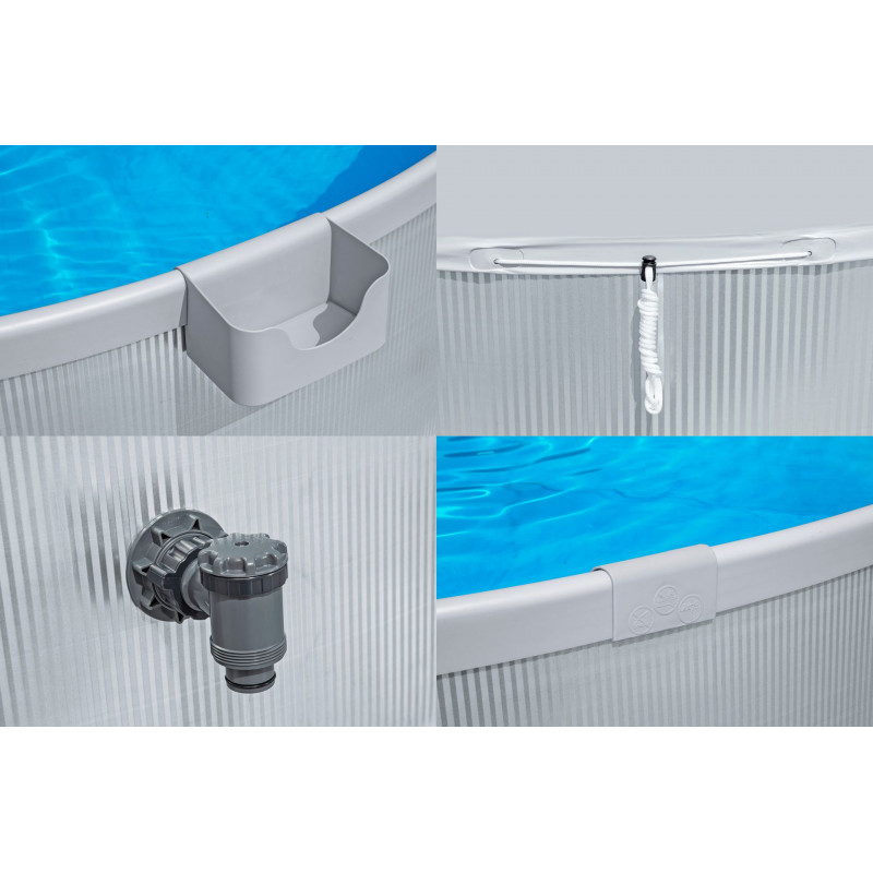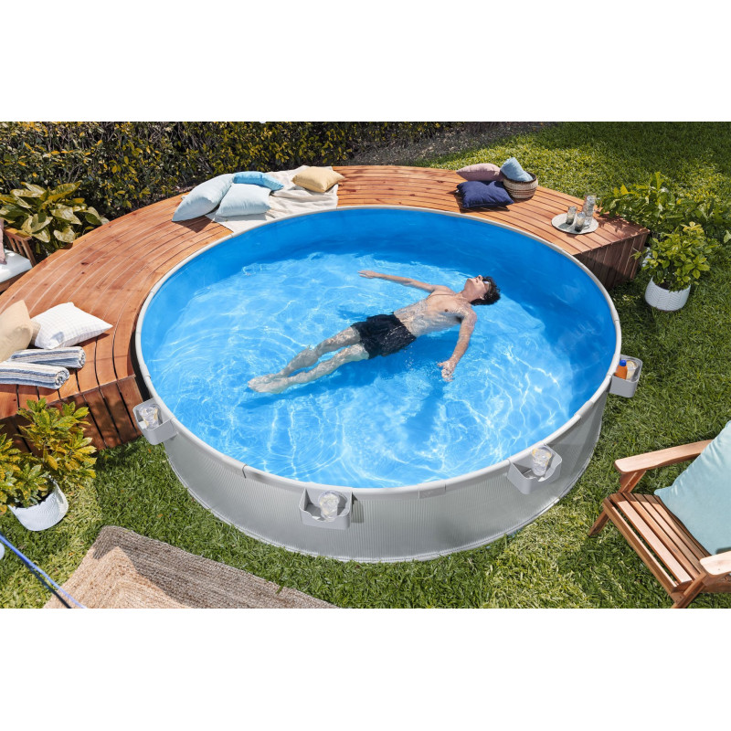 Parois en acier galvanisé garantissent longévité et résistance a la corrosion, tandis que le liner PVC rembourré avec protection UV offre confort et sécurité. Quatre porte-gobelets mobiles transforment la piscine en lounge privé, idéal pour la famille et les amis.