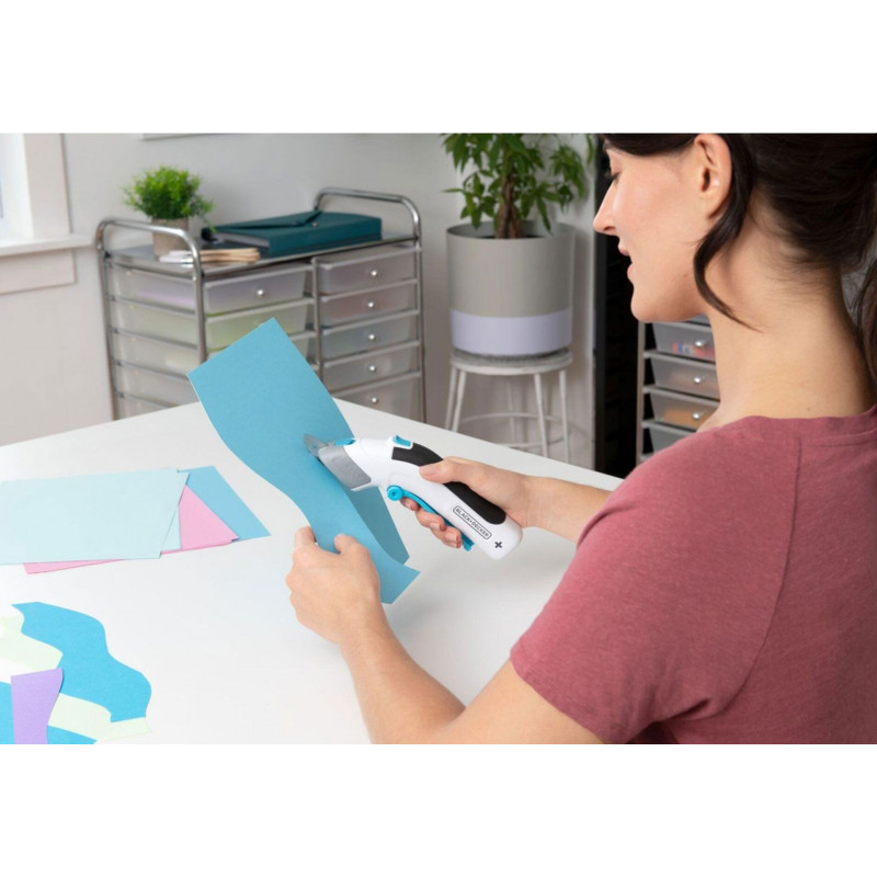 • UTILISATION SIMPLE : Une fois allumé, l’outil est prêt à vous accompagner dans les découpes de divers matériaux. Cette polyvalence est possible grâce aux 2 lames fournies : une lame (O) pour les tissus et papiers, et une lame (D) pour les matériaux plus exigeants comme le carton, le cuir et le plastique