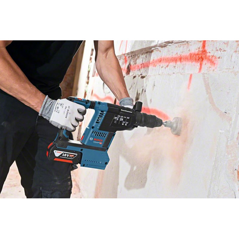 Le GBH 18V-26 F Professional avec mandrin interchangeable est le modele universel de la gamme des perforateurs sans-fil SDS plus Bosch, il est idéal pour un usage au quotidien. Un dispositif d’aspiration GDE 18V-16 Professional (vendu séparément) avec filtre HEPA peut etre intégré a l’outil pour constituer un systeme d’aspiration autonome offrant une mobilité maximale. Le perforateur dispose également de la fonction KickBack Control et d’une électronique EPC (Electronic Precision Control) pour une meilleure maîtrise et une meilleure protection de l’utilisateur. Son puissant moteur délivre une force de frappe de 2,6 J pour un enlevement de matiere rapide.