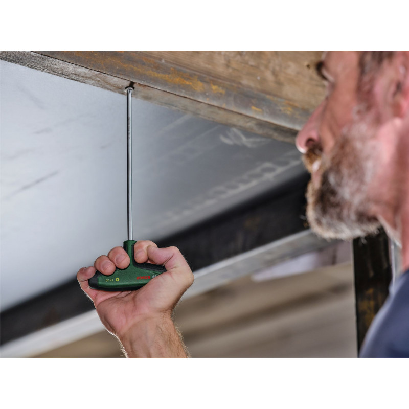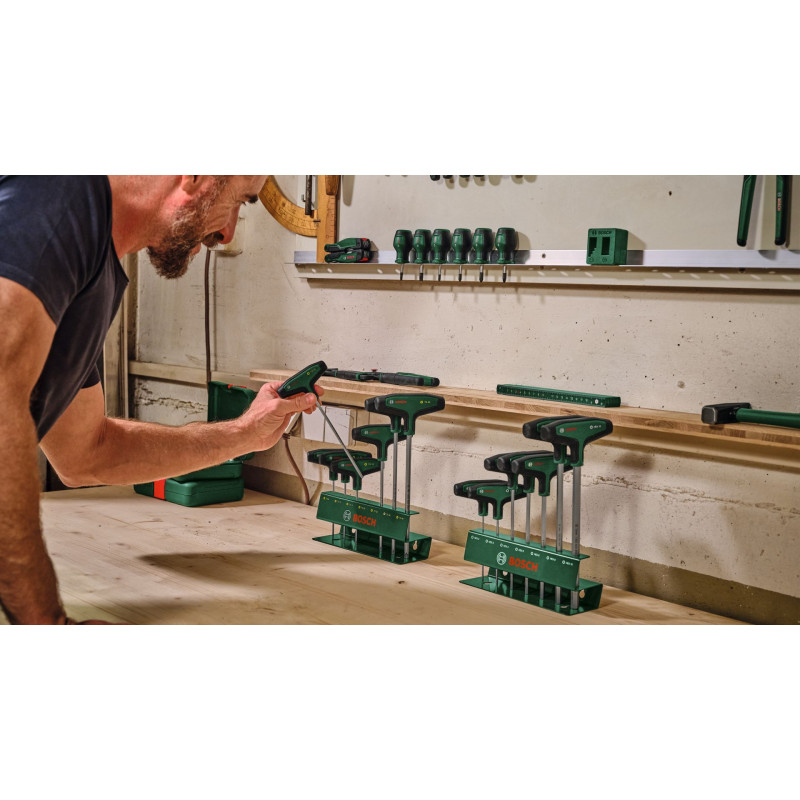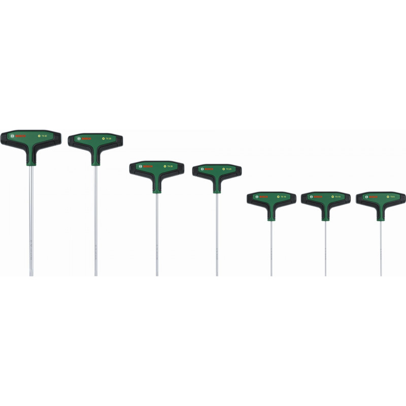 Le jeu de 7 tournevis Torx avec poignée en T de Bosch offre plus de confort et de flexibilité pour les travaux domestiques et d’aménagement intérieur. Tous les tournevis Torx avec poignée en T (TX9, TX10, TX15, TX20, TX25, TX30, TX40) sont vraiment exceptionnels pour un vissage maîtrisé et performant, meme dans les endroits difficiles d’acces, lors de l’assemblage de meubles ou de l’entretien de vélos, motos et voitures. Les poignées ergonomiques en T bi-composant avec de grandes zones softgrip sont conçues pour offrir un grand confort et une transmission efficace du couple lors des vissages, meme lorsqu’un couple élevé est requis. Chaque tournevis avec poignée en T est doté d’un manche en acier S2 de haute qualité (56 - 60 HRC). Les manches extra-longs permettent de travailler avec précision dans les endroits exigus et difficiles d’acces. Les indications de taille intuitives figurant sur le manche permettent de choisir facilement le bon tournevis pour chaque tâche. Bien rangés, les tournevis avec poignée en T sont livrés dans un rack métallique qui peut etre posé ou fixé sur un mur.