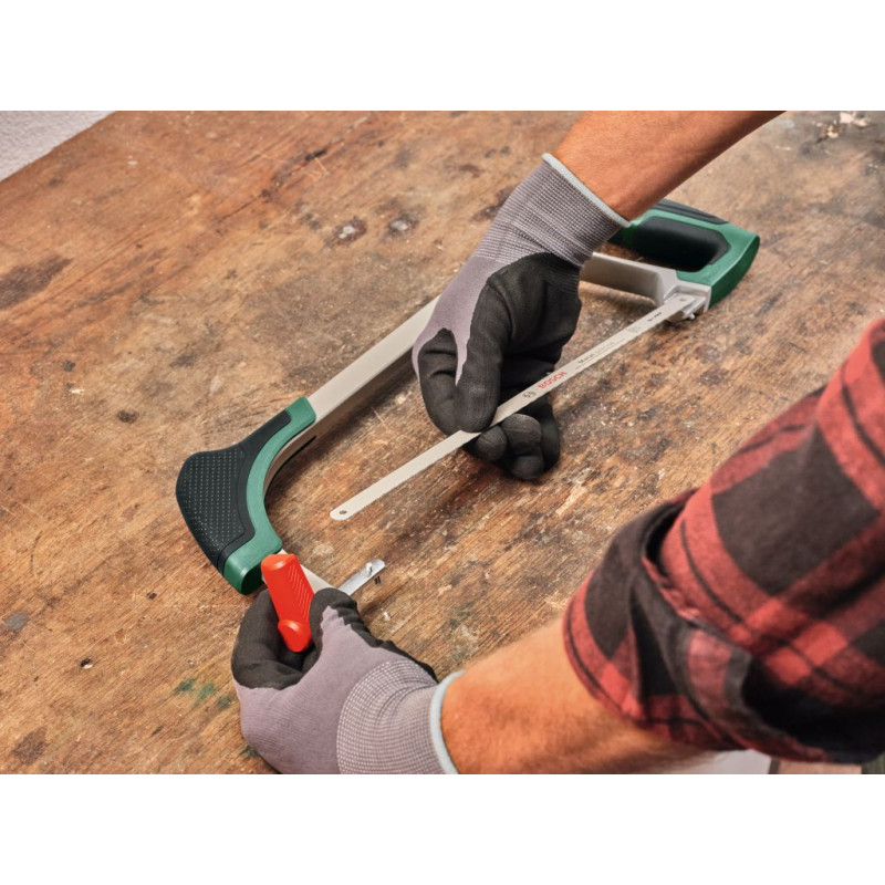 BOSCH Scie a métaux 300 mm (1600A02ZA8) est une scie a archet universelle adaptée a la coupe du métal, du plastique et du bois. Équipée d'une lame bimétallique de 300 mm a denture fine de 24 TPI, elle garantit des coupes propres et précises. La dureté des dents (entre 62 et 68 HRC) assure une longue durée de vie meme en cas d'utilisation intensive.