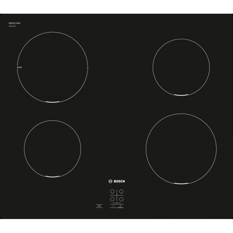 • BOSCH PUG611AA5E est une plaque de cuisson à induction dotée d'une surface de commande plate et de quatre zones de cuisson différentes.
