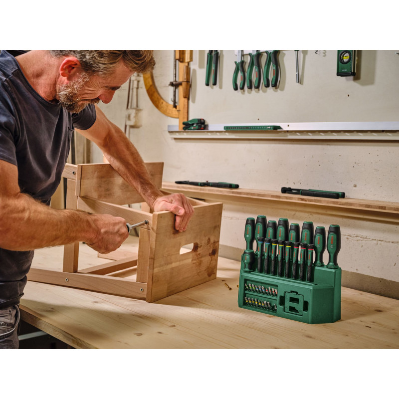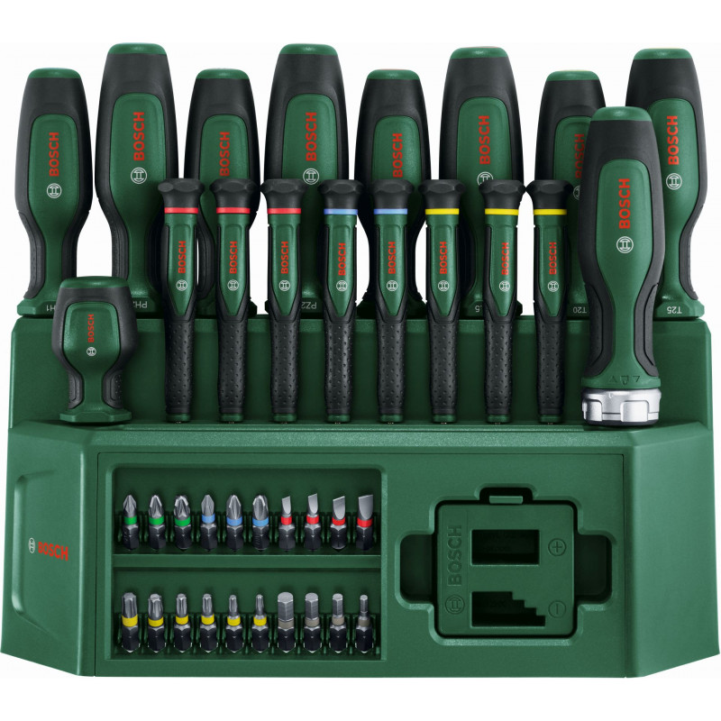Accomplissez rapidement et efficacement tous vos travaux de vissage avec le set de 39 tournevis mixtes Bosch de haute qualité. Le set comprend une large gamme de tournevis mixtes : 8 tournevis ordinaires (PH1/2, PZ1/2, SL4/6,5, TX20/25), 8 tournevis de précision (SL1,5/2,5/3, PH00/PH0, TX5/6/8), 1 tournevis a cliquet avec embout, un tournevis court et 20 embouts (PH1/2/3, PZ1/2/3, SL3/4/5/6, TX10/15/20/25/30,40, HEX3/4/5/6). Tous les tournevis sont fabriqués a partir de matériaux durables. Ils sont dotés de poignées softgrip bi-composant pour un confort ultime. Le code couleur permet de saisir les tournevis et les embouts plus facilement et plus rapidement. Le set comprend également un outil de magnétisation permettant d’aimanter et de démagnétiser facilement les pointes et les embouts de vissage. Il est fourni dans un rack pratique qui peut etre placé sur l’établi, offrant un rangement organisé et un acces facile.