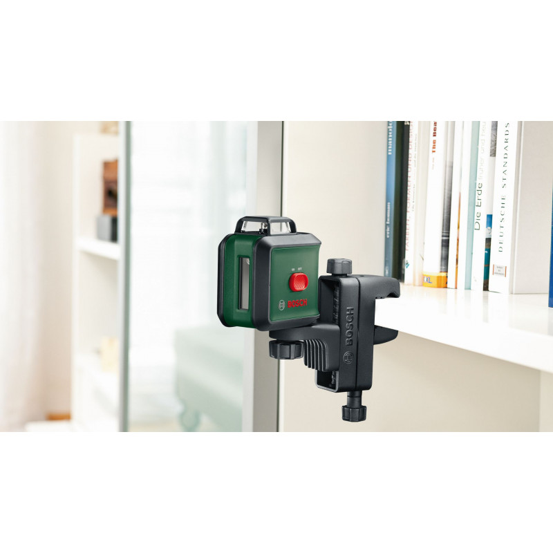 Avec ses lignes laser parfaitement visibles pour des alignements de grande précision dans toute une piece, le laser lignes UniversalLevel 360 allie précision, polyvalence et confort. La ligne laser horizontale sur 360° et la ligne verticale sur 120° toutes deux auto-nivelantes qui sont projetées permettent d’effectuer rapidement et avec commodité des alignements précis et la technologie laser verte améliorant grandement la visibilité assure un grand confort d’utilisation meme en cas de forte luminosité. Vous souhaitez installer des faux plafonds ou des tringles a rideaux a une meme hauteur ? Ou aligner des objets tels que des étageres ou des cadres photo a une hauteur bien précise ? Ou bien poser du carrelage avec des motifs créatifs ? Lancez-vous et laissez libre cours a votre créativité, sachant que la fonction d’inclinaison permet aussi de projeter des lignes obliques.