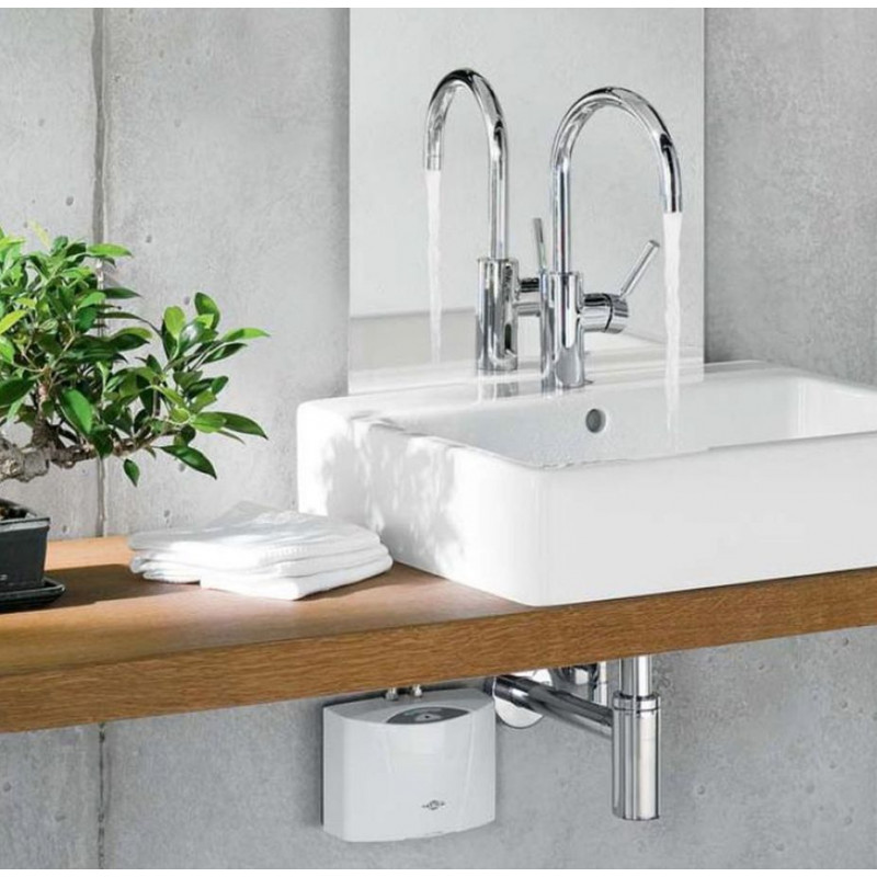 L’eau est chauffée instantanément lors de son passage, sans réservoir et sans pertes en mode veille. L’activation automatique de la pleine puissance de chauffe se fait des l’ouverture du robinet. Une installation sous le lavabo minimise les pertes thermiques dans la tuyauterie et réduit la consommation d’énergie.