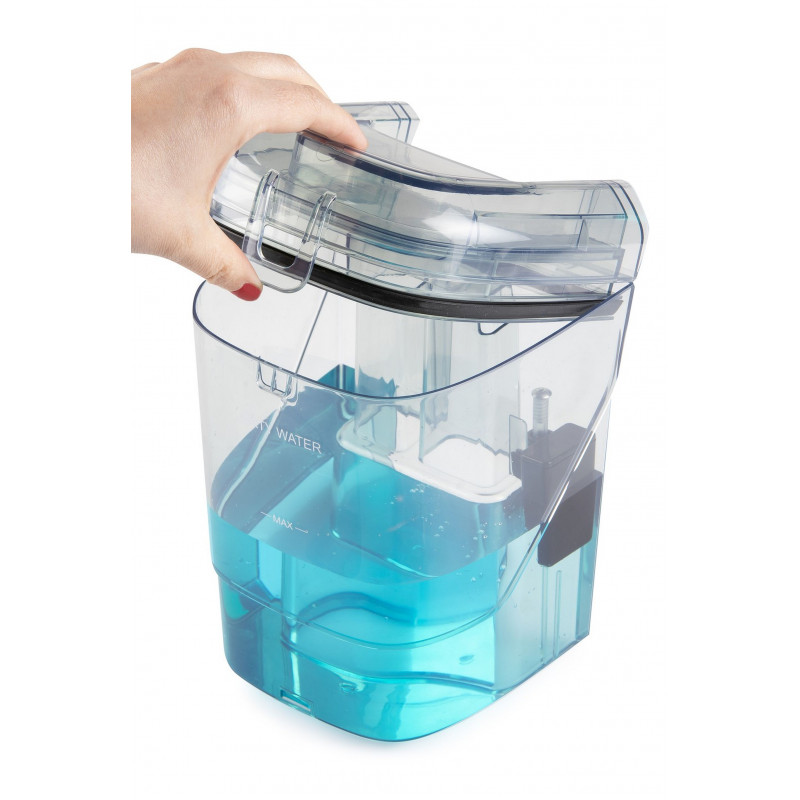 La fonction de pulvérisation électronique humidifie uniquement les zones nécessaires, tandis que l’eau sale est recueillie dans un réservoir séparé d’une capacité de 1,1 litre. Grâce au réservoir d’eau propre de 1,3 litre, a l’arret automatique lorsque le réservoir est plein et au rangement pratique pour le tuyau et le câble, l’utilisation de l’appareil est simple et tres confortable.