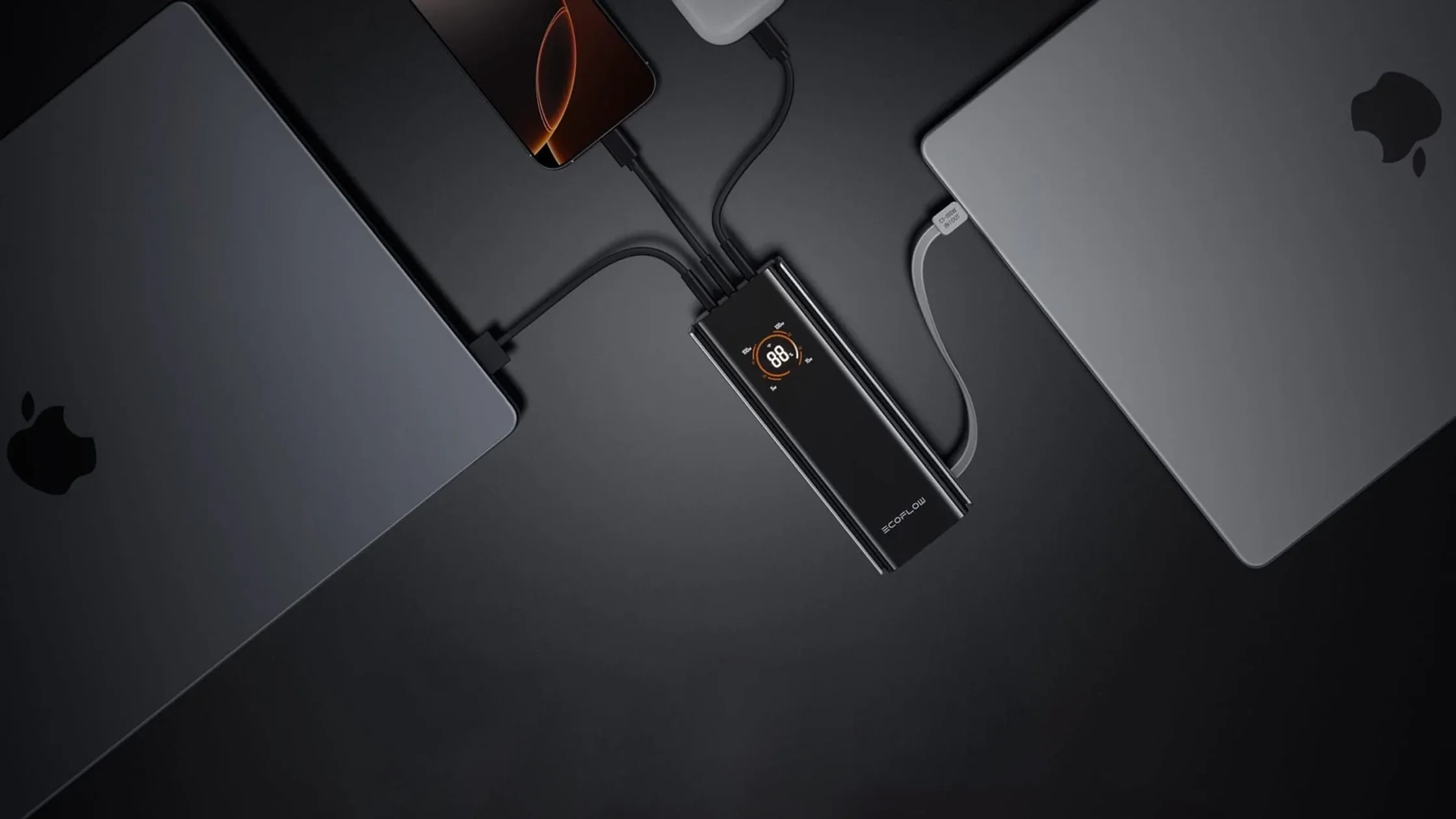 La caractéristique essentielle est le câble USB-C intégré de 60 cm, qui prend en charge une puissance allant jusqu’a 140 W et élimine le besoin de transporter des câbles supplémentaires. De plus, la powerbank dispose de deux autres ports USB-C et d’un port USB-A, tous compatibles avec les standards de charge modernes (PD 3.1, QC 3.0, PPS, FCP, SCP, Apple 2.4A, etc.).