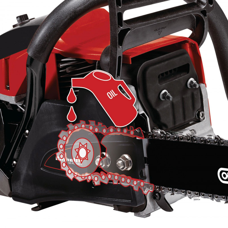 La tronçonneuse thermique Einhell GC-PC 2040 I est un outil performant, extremement tranchant, mais également tres sur et ergonomique. L'association de la qualité d'une tronçonneuse Einhell et d'un guide et d'une chaîne OREGON assure au jardinier passionné une aide efficace et fiable. Cette tronçonneuse est l'idéal aussi bien pour les travaux simples que pour les plus difficiles, dans le jardin ou a l'atelier. Le moteur a 2 temps refroidi a l’air avec roulements a billes aux deux extrémités du vilebrequin fournit suffisamment de puissance pour gérer meme les plus fortes résistances. Branches, bois de construction ou bois de chauffage, il n'y a rien que cette tronçoneuse thermique ne puisse couper. La conception technique de cette tronçonneuse en fait un outil facile d'utilisation et sécuritaire. Le systeme anti-vibration augmente le confort et réduit la fatigue pendant l'utilisation. L’amorce et l’auto-étranglement éliminent les problemes de démarrage a froid. L’allumage numérique assure une alimentation en essence rapide et dynamique et un fonctionnement stable du moteur. Une protection anti-retour avec blocage instantané de la chaîne assure une sécurité optimale de l'utilisateur. La tronçonneuse est également équipée d'un systeme de protection dans l'éventualité ou la chaîne venait a sauter du guide de coupe. Une griffe d’arret en métal, large et robuste, assure une utilisation sure et pratique pour tous types de travaux. Le systeme de lubrification automatique de la chaîne assure un niveau suffisant d’huile pour un fonctionnement optimal. Un protecteur de rail de coupe est prévu pour un stockage simple et en toute sécurité. Une bouteille de mélange pour essence/huile est également incluse.