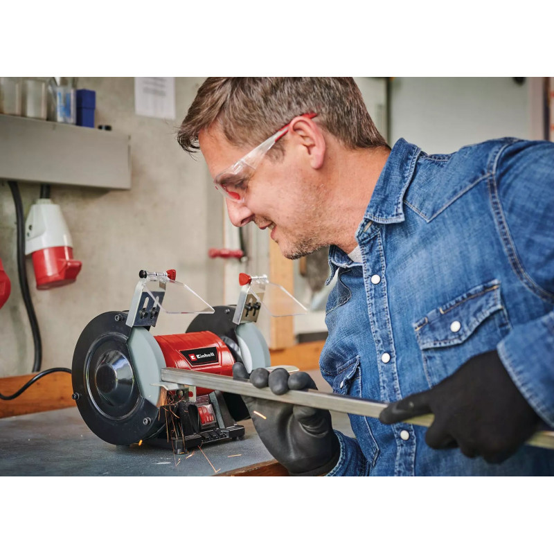 Le touret a meuler TC-BG 150 Einhell est une meuleuse tres pratique et polyvalente. Les tourets a meule double, dans lesquels chaque meule est entraînée par un moteur, font partie de l’équipement de base au sein d’un atelier. Ils permettent d’affuter aussi bien les ciseaux, couteaux et lames, que les outils de coupe, forets, et fraises, y compris les burins. Ce touret a meuler peut en outre etre utilisé pour décaper, ébavurer, poncer et polir différentes pieces en bois, en plastique et en métal. Il est particulierement adapté aux petites corrections de forme et a l’affutage de lames, mais aussi aux corrections de forme plus importantes et aux polissages. Son bâti métallique compact et robuste lui assure une longue durée de vie. Les grands supports de travail ajustables permettent des applications diverses, et les arbres porte-meules sur roulement a billes montés sans jeu garantissent des résultats précis. Les pare-étincelles réglables sans outil et les capots de protection fermés sur les côtés contribuent a la sécurité. Quatre patins en caoutchouc amortissent les vibrations et apportent une bonne stabilité. Une meule de dégrossissage et une meule de ponçage fin (K36/K60) sont fournies de série.