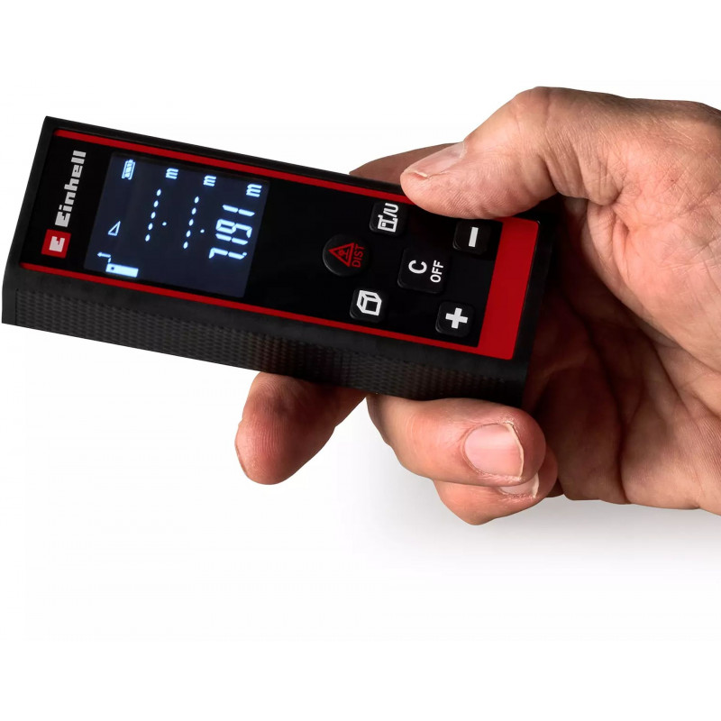 Le télémetre laser Einhell TC-LD 60 R est un outil de mesure précis et polyvalent destiné a une utilisation dans la maison, au jardin ou sur le chantier. Avec une portée comprise entre 0,05 m et 60 m, il fournit des résultats précis grâce a la classe laser II et a une longueur d’onde de 635 nm. L’exactitude de +/- 2 mm de ses lignes garantit une précision maximale pour vos calculs de distances, de surfaces ou de volumes. La mesure s’effectue a partir de deux points de référence au choix, situés a l’avant ou en dessous de l’appareil. Vous pouvez choisir parmi les unités de mesure suivantes : metres, pieds et pouces. Ce télémetre laser offre plusieurs modes : la mesure continue permet de déterminer des distances en continu, tandis que la fonction Pythagore permet des mesures indirectes de longueur et de hauteur. La fonction repérage garantit un positionnement a intervalles réguliers, par exemple pour la pose de poteaux de clôture. Les distances, surfaces et volumes mesurés peuvent etre additionnés ou soustraits – idéal en cas de calculs complexes. L’écran LCD rétroéclairé affiche clairement les résultats de mesure et vous pouvez enregistrer jusqu’a 20 mesures. Par sécurité, le laser est activable séparément et l’arret automatique apres 1 minute d’inactivité préserve la batterie. Grâce aux surfaces Softgrip, le boîtier est agréable et tient bien en main. Le télémetre laser est fourni avec une sacoche pratique. L’appareil fonctionne avec deux piles AAA 1,5 V non fournies.