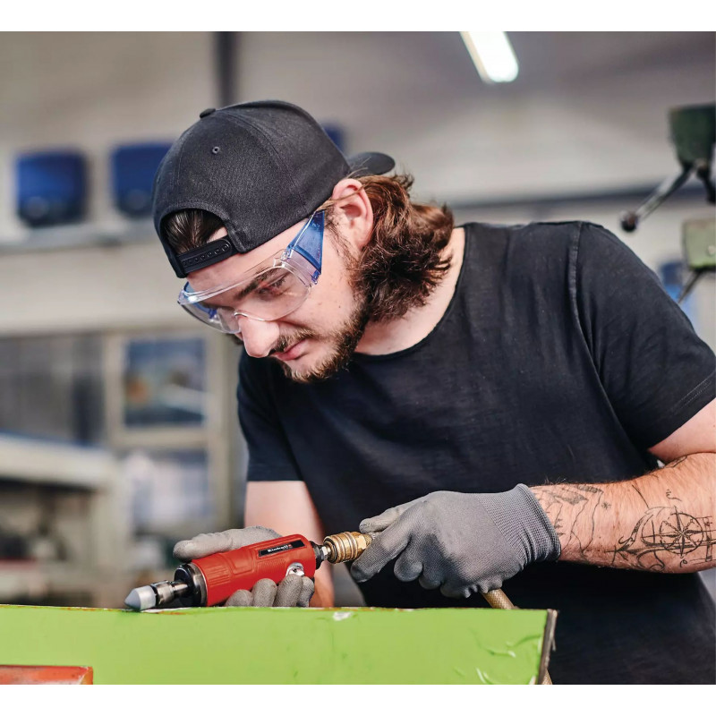 Avec la meuleuse droite a air comprimé Einhell TC-PP 220, le bricoleur expérimenté dispose d’un outil puissant pour les travaux a la maison, a l’atelier ou au garage. Avec une vitesse de rotation maximale de 22 000 tour/min, cet outil permet de réaliser avec précision et puissance des travaux de ponçage, de polissage, de gravure ou d’ébavurage. Cette ponceuse droite Einhell offre une performance optimale a partir d’un diametre intérieur de tuyau de 9 mm. La poignée en caoutchouc permet une utilisation confortable et sure. La meuleuse droite a air comprimé est conçue de maniere optimale pour une utilisation d’une seule main. La gâchette de sécurité prévient tout démarrage intempestif. Les 10 meules sur tige fournies en accessoires offrent de multiples possibilités d’utilisation. Sont également vendus avec la meuleuse droite 1 burette d’huile, 1 raccord et 2 clés de serrage. L'outil est vendu dans son coffret de transport et de rangement tres pratique.