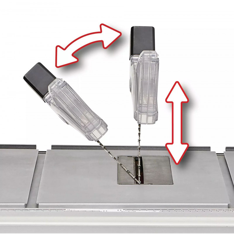 Le systeme de manivelles positionné sur le bâti permet d’ajuster d’une seule main et pour chaque coupe aussi bien la hauteur que l’angle de la lame de scie.
