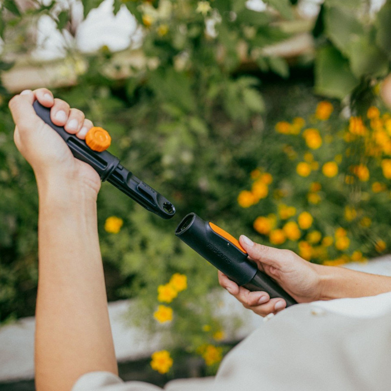 L’adaptateur universel Fiskars OneClick permet de connecter différentes tetes interchangeables d’autres fabricants aux manches du systeme Fiskars OneClick. Il élargit la compatibilité des outils et augmente la flexibilité lors des travaux de jardinage.