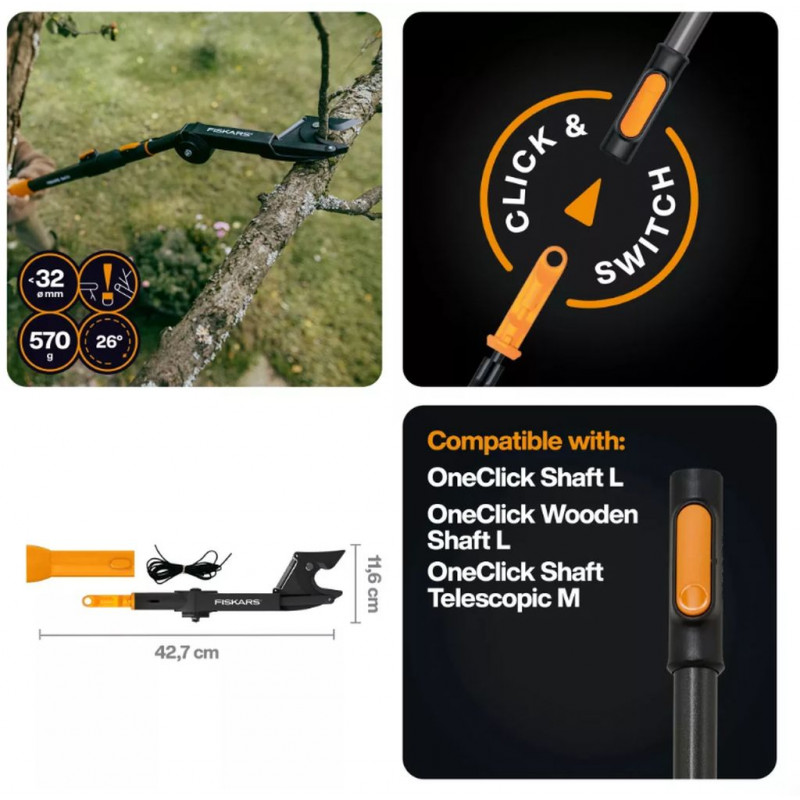 Les cisailles universelles Fiskars OneClick a lame unique sont conçues pour couper le bois sec et dur jusqu’a 32 mm de diametre. Le systeme OneClick assure une fixation rapide et solide a la perche, offrant un contrôle parfait meme avec la perche télescopique étendue.