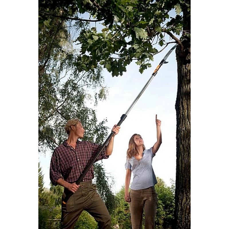 • S’utilise pour l’élagage en hauteur (avec la scie courbe) mais aussi pour la récolte de fruits (avec le cueille-fruits).
