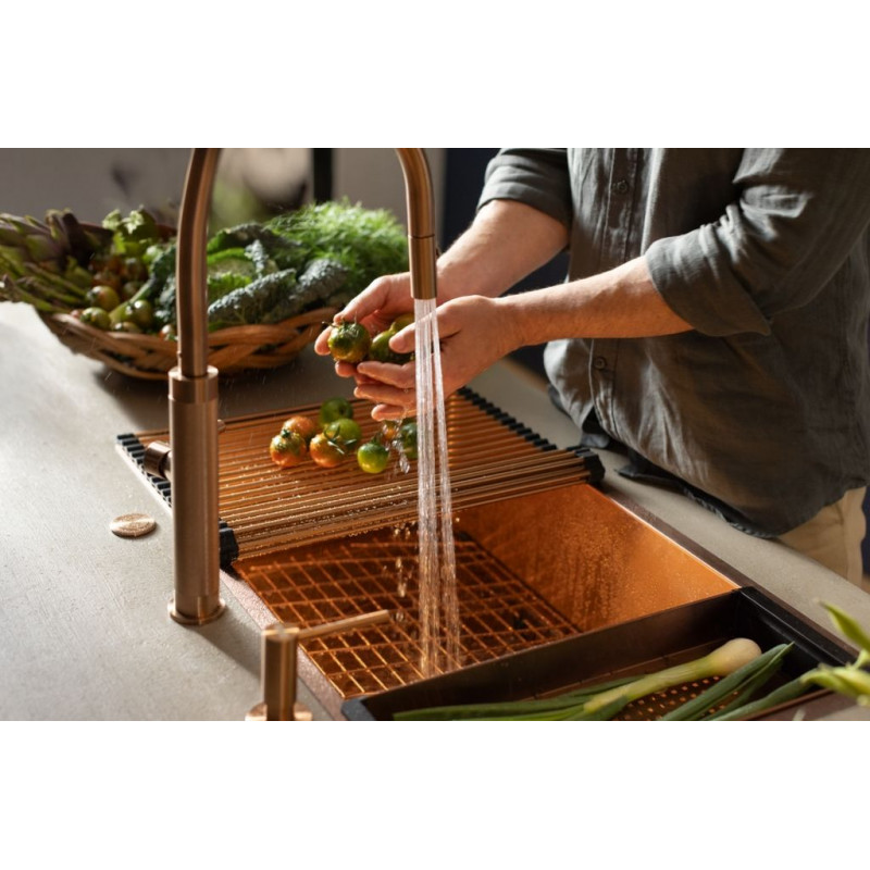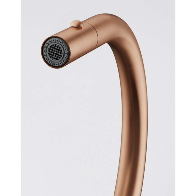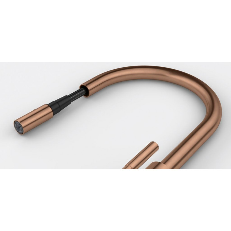 Mitigeur, MYTHOS MASTERPIECE douchette monojet, en inox, avec un revetement PVD cuivre . Durable, élégant et facile a entretenir. La fonction douchette facilite le rinçage en atteignant toutes les parties de l'évier.