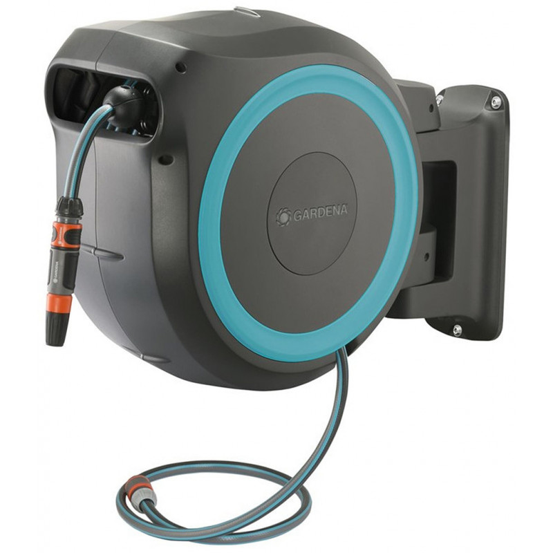 • Grâce à la technologie RollControl, le dévidoir automatique mural GARDENA est équipé d’un frein centrifuge, d’un ressort en acier de haute qualité pour un enroulement toujours fiable et homogène du tuyau et d’un guide-tuyau intégré pour éviter les torsions lors de l'enroulement du tuyau