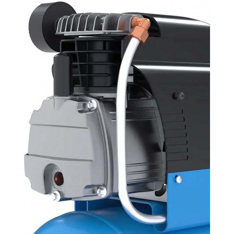 Le compresseur garantit un fonctionnement sur grâce a une soupape de sécurité, un clapet anti-retour et une vis de purge pour le condensat. Le filtre a air intégré protege le mécanisme contre les impuretés et prolonge sa durée de vie.