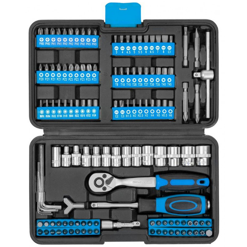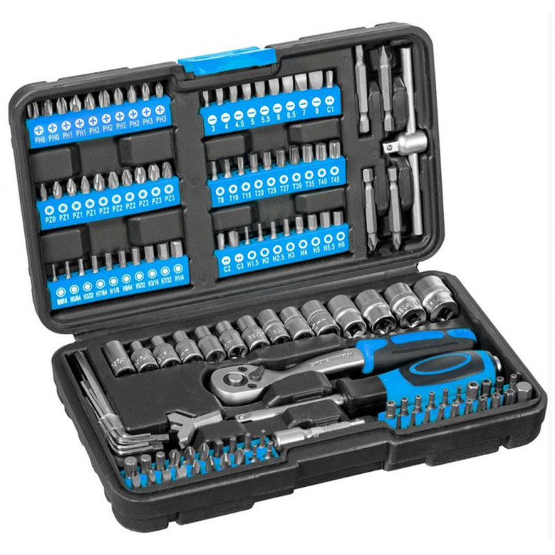 Ensemble complet d’outils pour un usage domestique et professionnel dans un format compact et pratique. Ensemble universel de 130 pieces en acier chrome-vanadium, idéal pour l’atelier a domicile, le garage ou un usage professionnel. Comprend un cliquet 1/4" a 72 dents, 13 douilles, 100 embouts et une mallette en plastique pratique pour un rangement organisé.