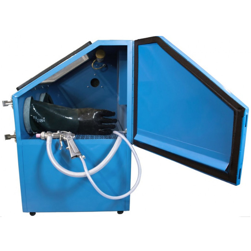 Cabine de sablage 110 litres, d'utilisation universelle pour l'industrie, le milieu automobile, la réparation, les loisirs, etc. La cabine de sablage professionnelle conçue pour un usage intensif - Robuste et solide -pour décaper la rouille, la peinture ou redonner un aspect neuf a vos pieces. Pour sable abrasif de 0,2 a 1,4 mm