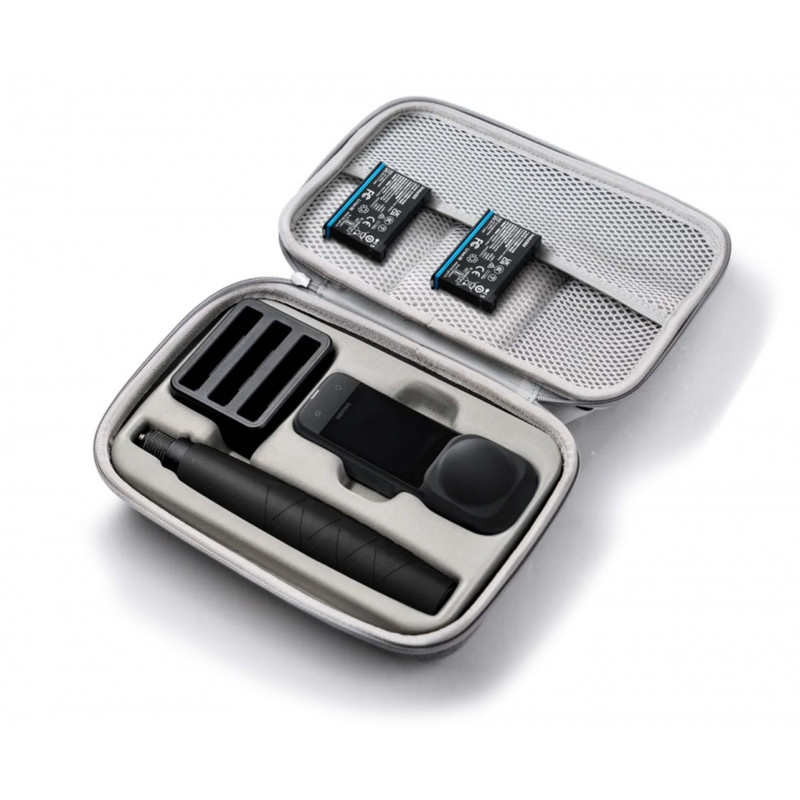 Étui renforcé conçu pour la caméra X4. Il peut contenir la caméra X4 (avec verre de protection standard ou premium, avec bouchon d’objectif et termogrip), 2 batteries, un hub de charge et une perche selfie de 85 cm.