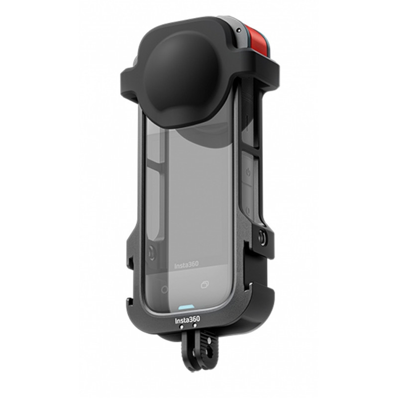 Cadre pour fixer des accessoires a la caméra Insta360 X4. Le cadre protege le boîtier et les objectifs de la caméra. Sur les deux côtés se trouve une rainure pour support (Cold shoe) et en dessous un adaptateur multifonction – filetage 1/4 pouce ou fourche. Inclus dans le pack : cadre pour X4, protection d’objectif.