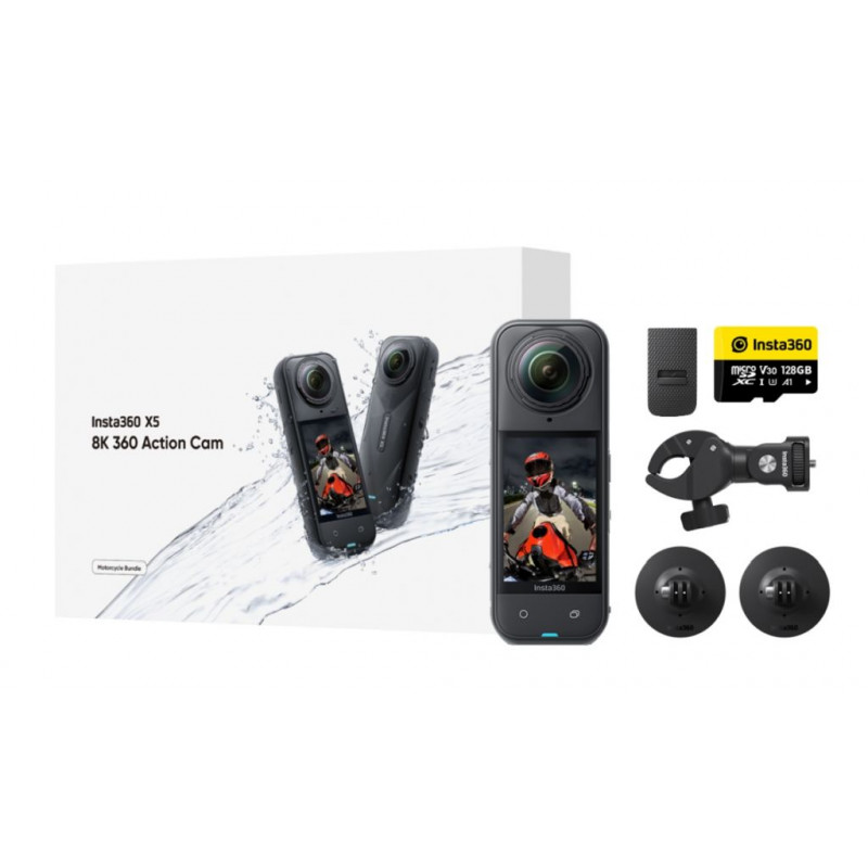 Le pack comprend tous les accessoires nécessaires pour commencer a filmer immédiatement : caméra Insta360 X5, carte mémoire 128 Go, pince Heavy Duty Clamp, lentilles interchangeables, câble USB, étui de transport et fixations sécurisées.