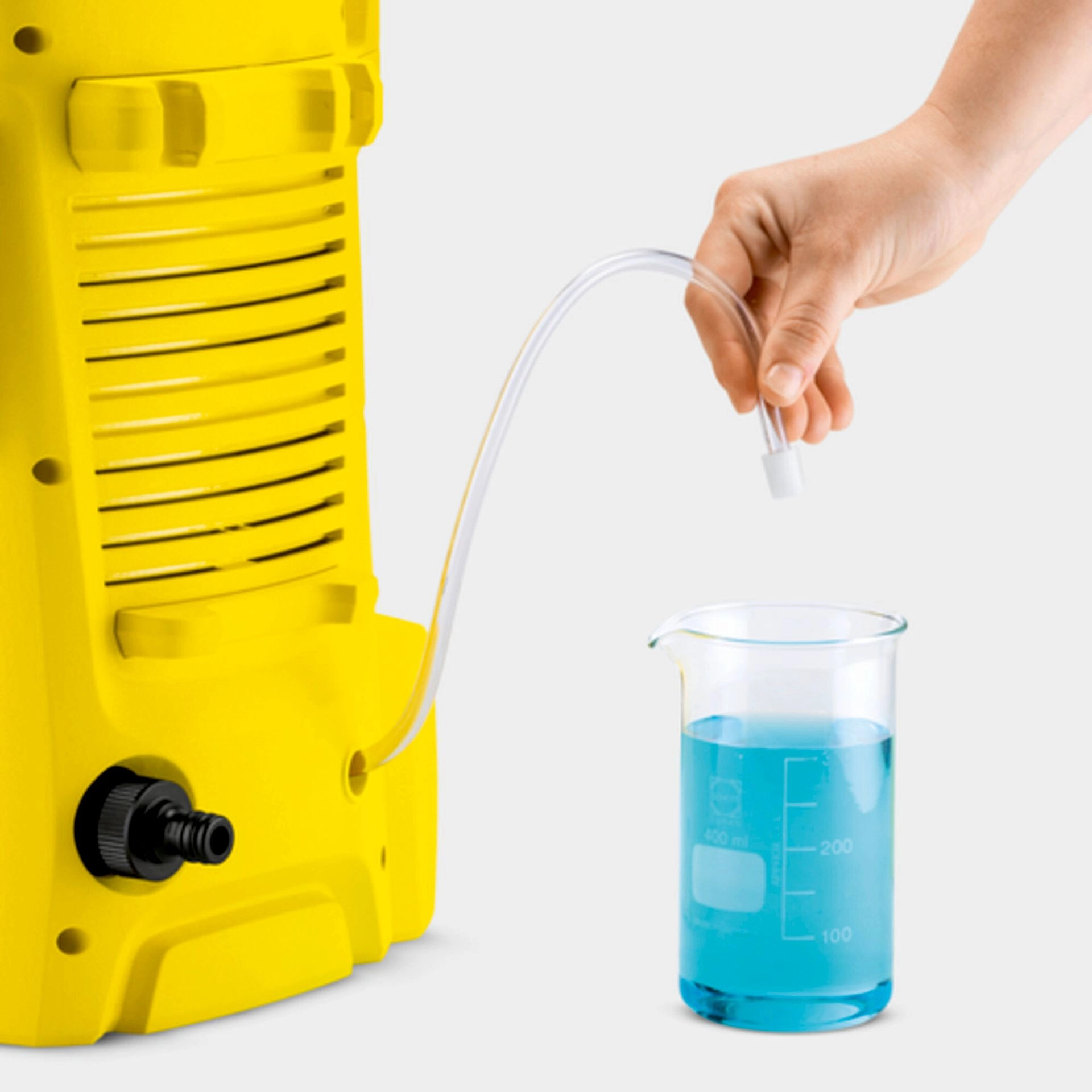 Tuyau d’aspiration intégré pour l’utilisation de produits de nettoyage Kärcher, qui améliorent l’efficacité du nettoyage et protegent les surfaces traitées.