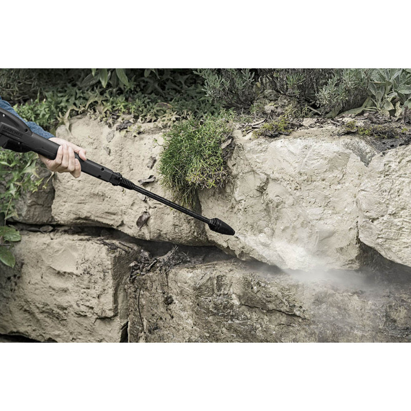 Grâce a l’application Kärcher Home & Garden, l’utilisateur trouve facilement la pression adaptée a chaque surface. L’assistant intégré fournit des conseils pratiques pour chaque situation et chaque tâche de nettoyage. La lance Vario Power permet un réglage continu de la pression, du jet basse pression pour détergent jusqu’au jet haute pression, par une simple rotation.
