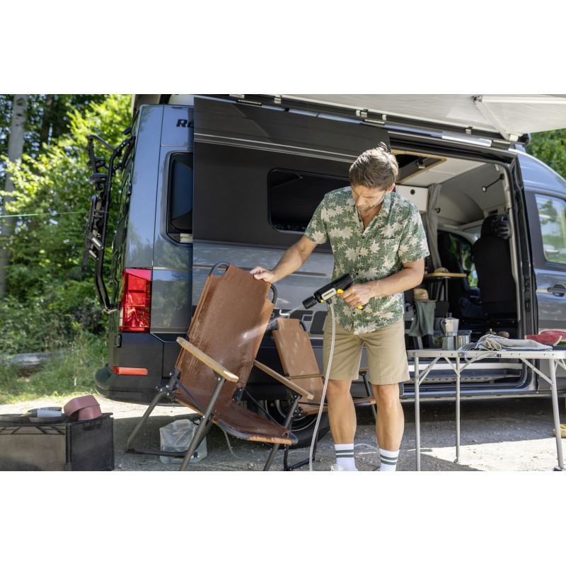 Kärcher OC Handheld Compact est un nettoyeur moyenne pression portatif, compact et pratique, idéal pour un usage mobile et flexible. Grâce a sa batterie lithium-ion intégrée et a son tuyau d’aspiration de 5 m, il permet de puiser l’eau a partir de sources externes, sans dépendre d’une prise électrique ou d’un raccordement a l’eau – parfait pour les déplacements, le camping, le jardin ou l’entretien domestique.