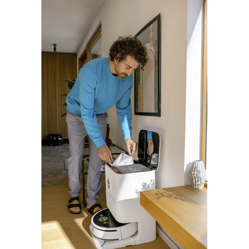 Sacs filtrants Kärcher de haute qualité, en non-tissé (fleece), conçus pour la station multifonction RVF 7 Comfort et la station d’aspiration RCV 5. Ils assurent un retrait hygiénique et facile de la poussiere et des saletés tout en maintenant une puissance d’aspiration constamment élevée pour un fonctionnement maximal efficace et autonome de l’aspirateur robot.