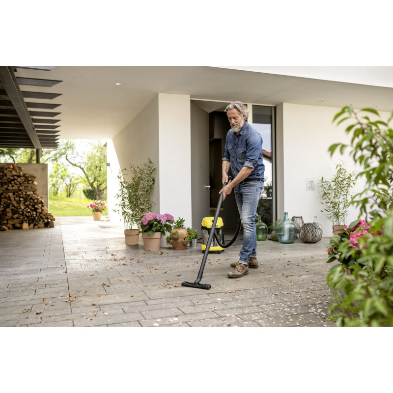 Sans fil. Sans limites : l'aspirateur eau et poussières sans fil WD 3-18 S fait partie de la plateforme de batterie Kärcher 18 V et se distingue par son niveau de flexibilité maximal, son format compact et sa liberté de mouvement. L'appareil, le flexible d'aspiration de 2 mètres et le suceur pour sol à attache sont parfaitement assortis et éliminent les saletés humides, fines ou grossières en un tour de main. En outre, l'appareil est équipé d'une cuve en acier inoxydable de 17 litres robuste et résistante aux chocs, d'un filtre à cartouche monobloc ainsi que d'un sachet filtre en non-tissé. Le rangement du flexible d'aspiration est possible avec un encombrement minimal et en toute sécurité en l'accrochant sur la tête de l'appareil. Parmi les autres équipements, on trouve la fonction de soufflerie pratique pour les endroits où il n'est pas possible d'aspirer, la surface de rangement pour les outils et les petites pièces, le bouton rotatif pour une mise en marche et à l'arrêt simples de l'appareil, la poignée de transport ergonomique ainsi que le système de verrouillage « Pull & Push » pour ouvrir et fermer facilement la cuve. Lors des pauses, les tubes et le suceur pour sol peuvent également être entreposés rapidement et en tout confort grâce à la position de stationnement prévue sur le pare-chocs.