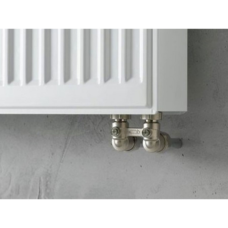 Le radiateur a vanne intégrée de Kermi est raccordé en bas sur le côté. L'insert de vanne avec valeurs kv préréglées en usine est intégré en usine pour l'exécution a vanne.