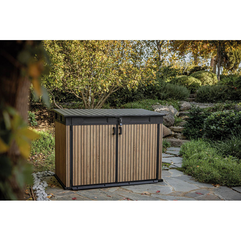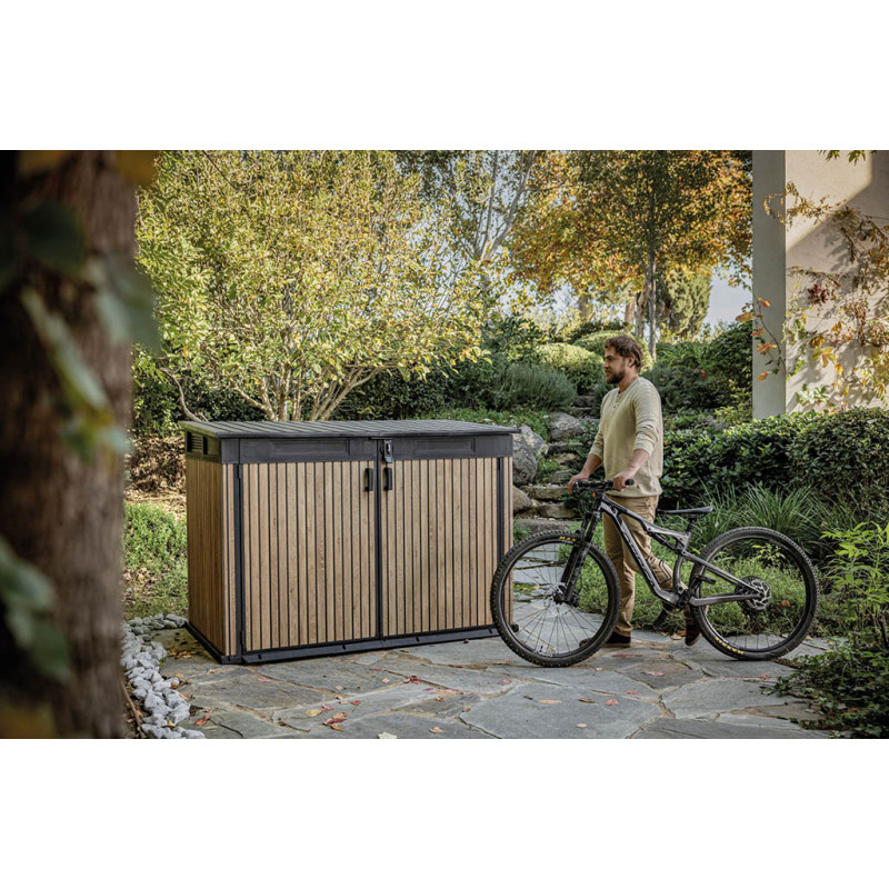 Le coffre de jardin horizontal de la collection Signature de Keter ne se contente pas de protéger vos vélos ou vos poubelles, rangés en toute sécurité derriere des portes verrouillables. Il ajoute également une note naturelle et accueillante dans votre jardin. Ce cabanon haut de gamme offre 2.020L de rangement permettant d'acceuillir facilement deux poubelles de 360L ou trois poubelles de 240L. Sa ventilation intégrée garantit que les odeurs ne persistent pas. Facile a assembler et a ouvrir a l’aide de pistons hydrauliques, cet abri horizontal est résistant aux intempéries et aux UV. Il est sans entretien, il ne rouillera jamais, ne se décolorera pas, ne se bosselera pas et ne s’écaillera jamais.