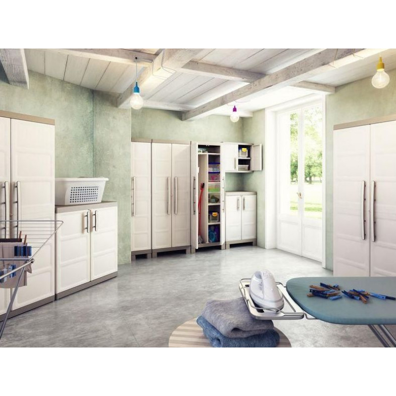 Armoire haute Excellence XL en plastique a pieds surélevés et 4 tablettes réglables. Lignes élégantes, poignée ergonomique et 2 bacs intérieurs a placer sur les portes pour une armoire fonctionnelle et esthétique.