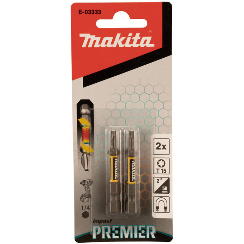 - Pro odeslání do Česka navštivte MAKITA E-03333 torzní bit řady Impact Premier (E-form), T15-50mm, 2ks