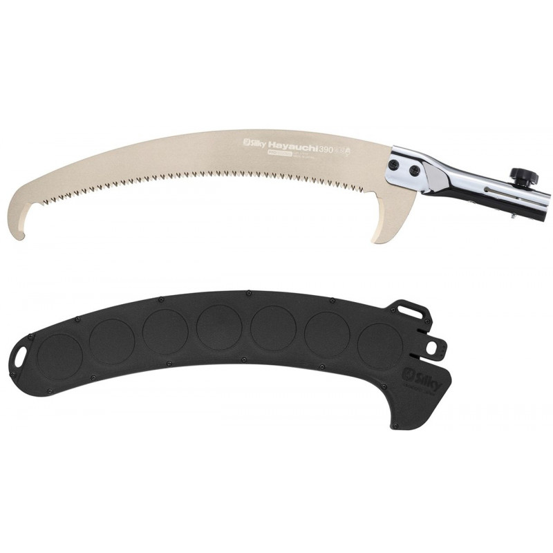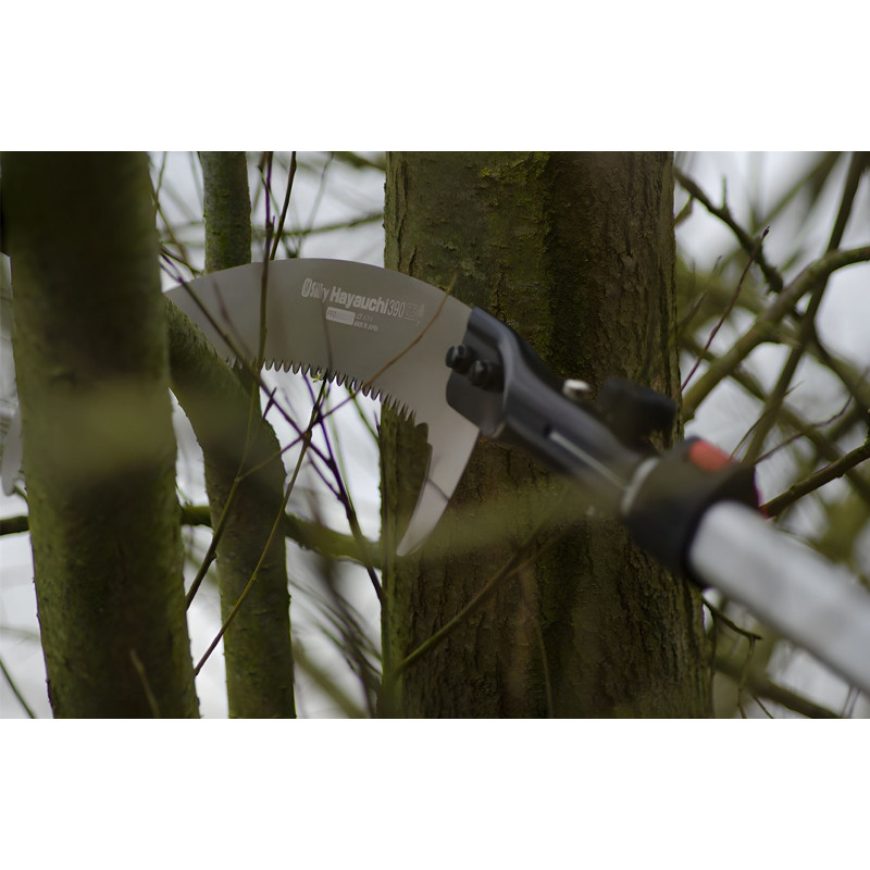 Élaguer a distance nécessite une scie fiable et polyvalente. La lame courbe Hayauchi de 390 mm de long est équipée de la denture unique Silky 4-RETSUME. Ce qui permet de faire une grande entaille dans le bois, et de scier tres rapidement les branches les plus épaisses et vous donne la possibilité de scier dans tous les sens. Idéale pour les gros travaux ! La lame est réglable sur deux angles différents pour l’élagage haut et bas.
