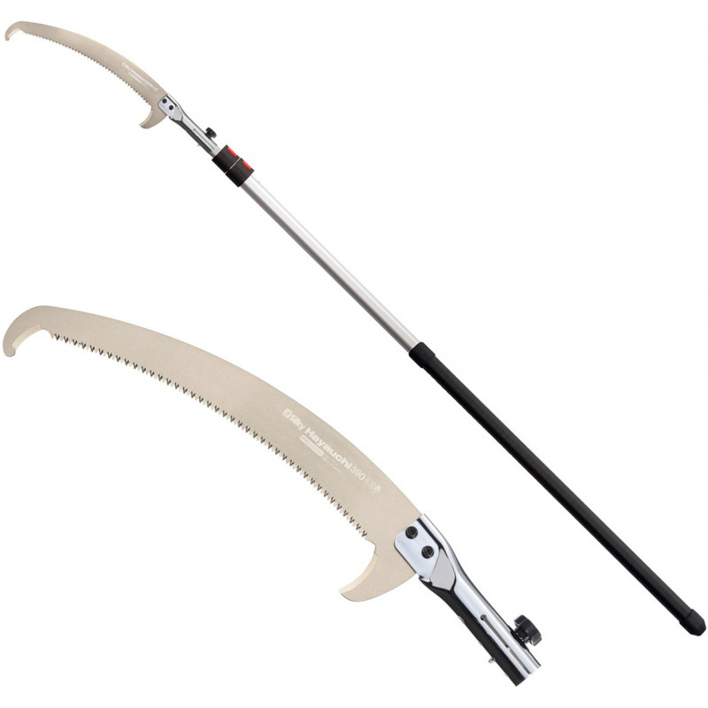 Élaguer a distance nécessite une scie fiable et polyvalente. La lame courbe Hayauchi de 390 mm de long est équipée de la denture unique Silky 4-RETSUME. Ce qui permet de faire une grande entaille dans le bois, et de scier tres rapidement les branches les plus épaisses et vous donne la possibilité de scier dans tous les sens. Idéale pour les gros travaux ! La lame est réglable sur deux angles différents pour l’élagage haut et bas.