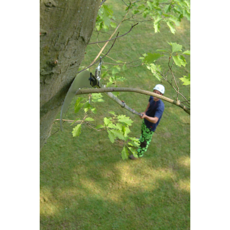 Élaguer a distance nécessite une scie fiable et polyvalente. La lame courbe Hayauchi de 390 mm de long est équipée de la denture unique Silky 4-RETSUME. Ce qui permet de faire une grande entaille dans le bois, et de scier tres rapidement les branches les plus épaisses et vous donne la possibilité de scier dans tous les sens. Idéale pour les gros travaux ! La lame est réglable sur deux angles différents pour l’élagage haut et bas.