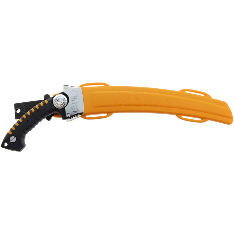 La poignée ergonomique en caoutchouc moulé absorbe les vibrations et offre une excellente prise en main, meme avec des gants, par temps humide ou froid. La couleur jaune du fourreau le rend bien visible et permet de l’attacher facilement a un harnais ou a la jambe avec des sangles Silky.