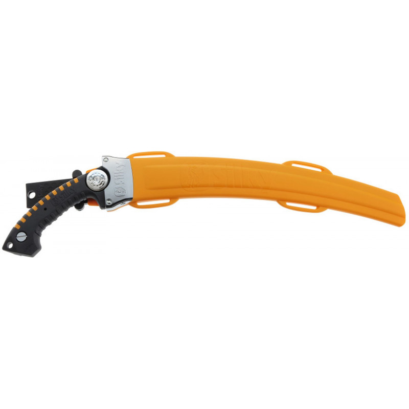 La scie est fournie avec un fourreau en polypropylene bien visible, équipé d’un passant de ceinture détachable et de rouleaux internes qui protegent les dents. Le bas du fourreau est partiellement ouvert afin de permettre l’évacuation de l’humidité et de la sciure.