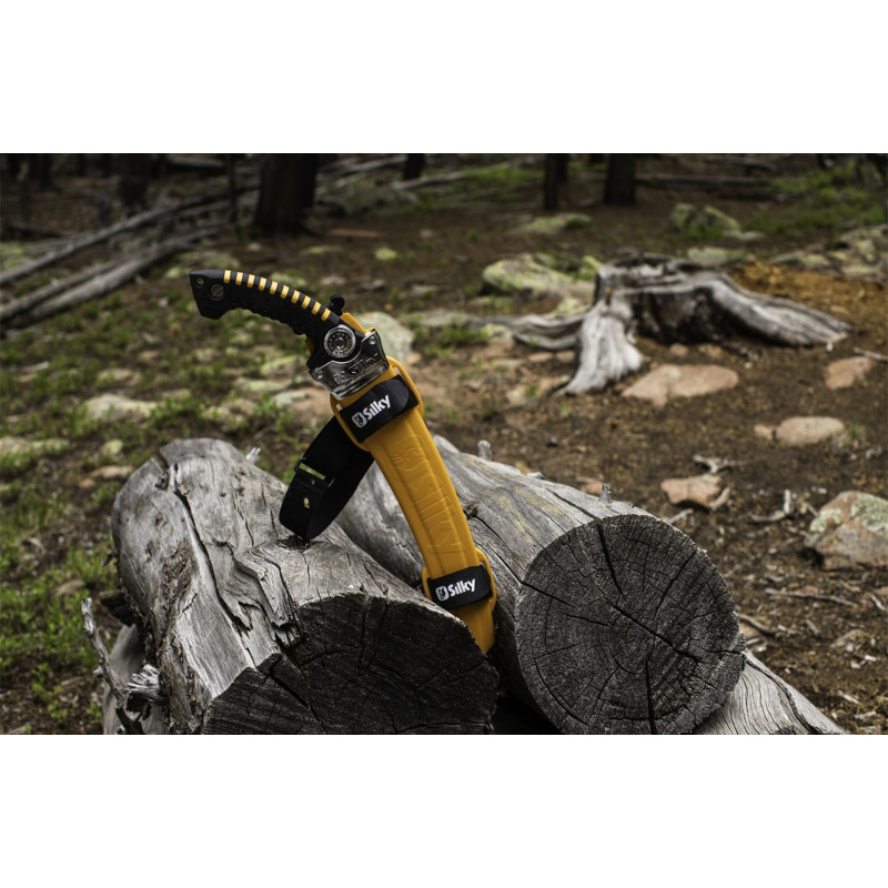 La poignée ergonomique en caoutchouc moulé absorbe les vibrations et offre une excellente prise en main, meme avec des gants, par temps humide ou froid. La couleur jaune du fourreau le rend bien visible et permet de l’attacher facilement a un harnais ou a la jambe avec des sangles Silky.