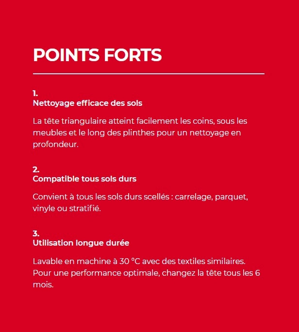 Sa tete triangulaire atteint aisément les angles, les dessous de meubles et les plinthes pour un nettoyage complet, sans effort.